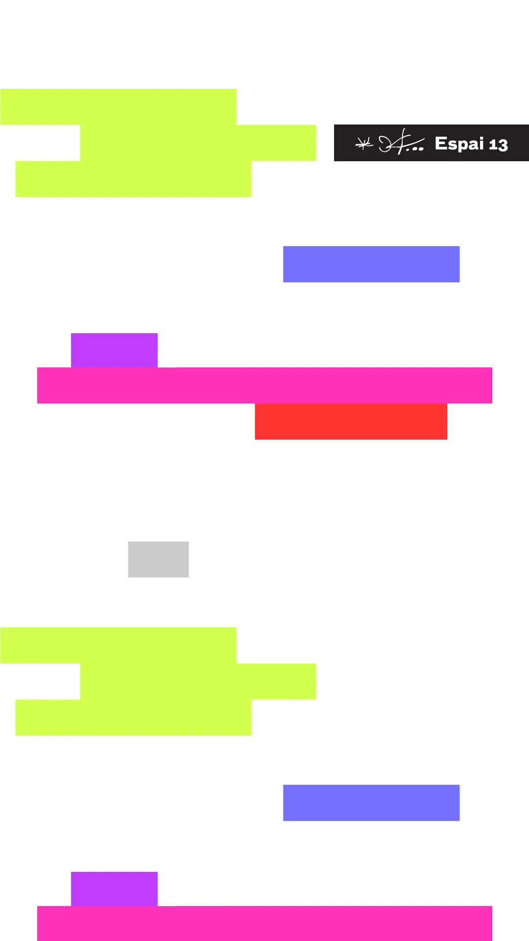 Espai13 gallery space of the Joan Miró Foundation presented “Fixacions per minut”, a curatorial program on the relationship between reading and contemporary art for its 2022/23 season. We designed and identity system for the exhibition cycle based on graphic resources from the field of reading, such as reading comprehension tools or syntactic analysis. This allows us to develop a communication campaign in which we explore other ways of designing, for example, hierarchizing through repetition instead of size.